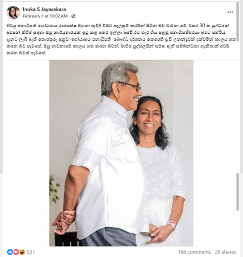 ඔහු එවැනි තීරණයක් ගෙන ඇති බවට ගෝඨාභය රාජපක්ෂ මහතා කිසිදු වැඩසටහනක හෝ ප්රකාශ කර ඇත්ද යන්න පරීක්ෂා කළ ත්, ඒ මහතා විසින් එවැනි ප්රකාශයක් කර නොතිබුණි. එමෙන් ම ගෝඨාභය රාජපක්ෂ මහතාගේ නිල සමාජ මාධ්ය ගිණුම් වල මෙන් ම ඔහුගේ ඥාතීන් වන දේශපාලනයේ නියැලෙන ප්රබලයන්ගේ සමාජ මාධ්ය ගිණුම් වල හෝ වෙනත් කිසිදු ස්ථානයක ප්රකාශයක් කර නොමැති බවට අප කළ පරීක්ෂාවේදී තහවුරු විය. මෙම වාර්තාව සකසන අවස්ථාවේ ගෝඨාභය රාජපක්ෂ මහතාගේ ෆේස්බුක් ගිණුම අවසන් වරට යාවත් කාලීන කර තිබුණේ, 2025 වසරේ ඔක්තෝම්බර් 14 වන දිනයි.